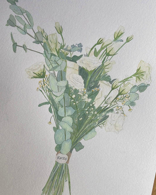 Ilustración personalizada en acuarela del ramo de novia